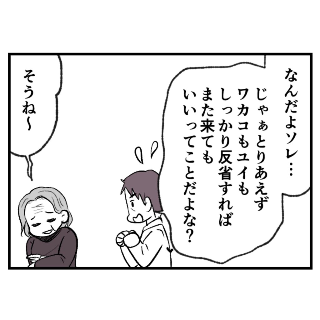 俺:「母さんがさ、これからもワカコやユイも実家に来ていいって言っているんだ! 詳しくは帰ったら話すけれど、言葉の行き違いがあったみたいで……」
