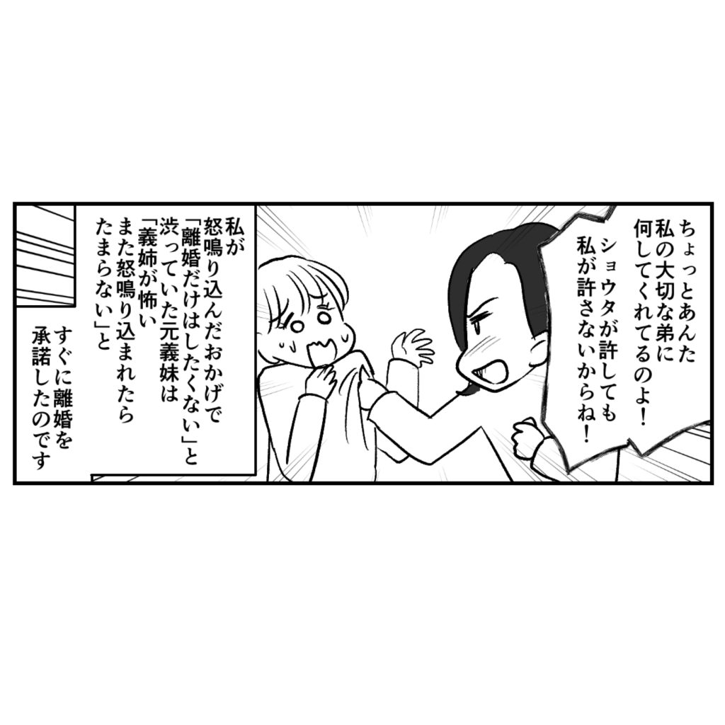 私のあまりの剣幕に元義妹は震えあがっていました。ショウタや両親には怒られてしまいましたが、私は間違ったことをしたとは思っていません。だって私が怒鳴り込んだおかげで、「離婚だけはしたくない」と渋っていた元義妹も、すぐに離婚を承諾したのですから。やはりショウタの幸せには私が必要不可欠なのだと感じました。