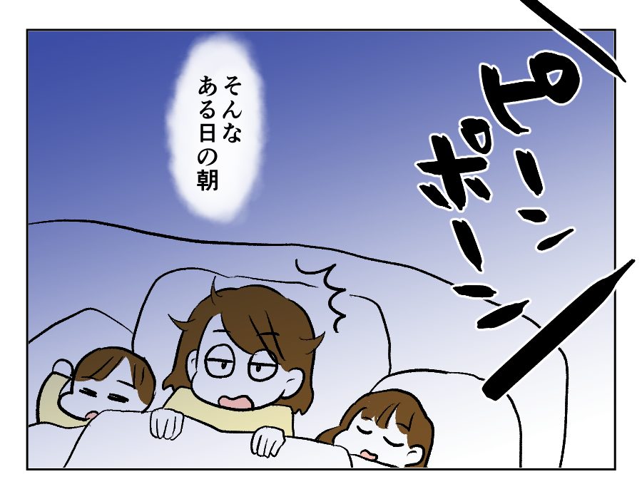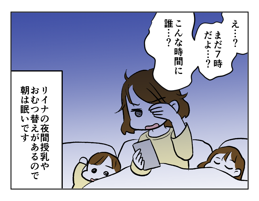 日曜の朝7時に鳴るチャイム……かなり違和感がありますよね。なにか緊急の用事でもあったのでしょうか。どちらにしても少しイヤな予感がします。まだまだ子どもたちが小さく、夜中に授乳や夜泣きなどもあるため、細切れ睡眠が続くミサキさん。睡眠不足のツラい身体に鞭打って、来客が誰なのかを確認しに行ったようです。