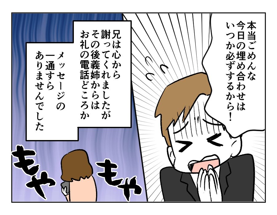 送別会も終わっているのだったら、その日の夜、もしくは翌日の午前中くらいにでも、「預かってくれてありがとう」「突然でごめんなさい」くらいのメッセージがあっていいですよね。それが一言もないなんて……! お義姉さんは「預かって当然」くらいに考えているのでしょうか。いくらお兄さんが謝ってくれたとしても、これではモヤモヤが収まりません。