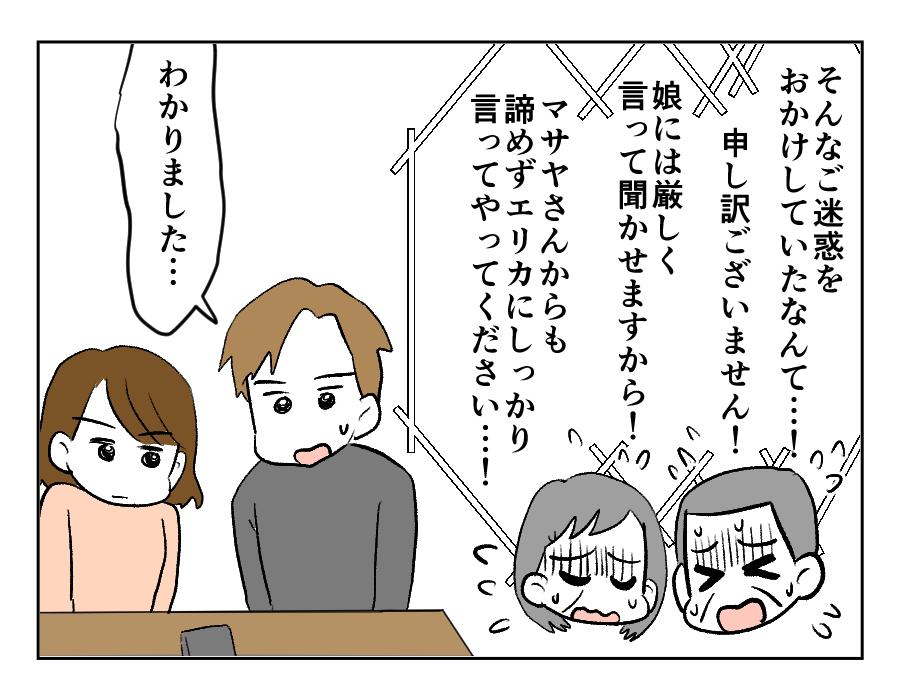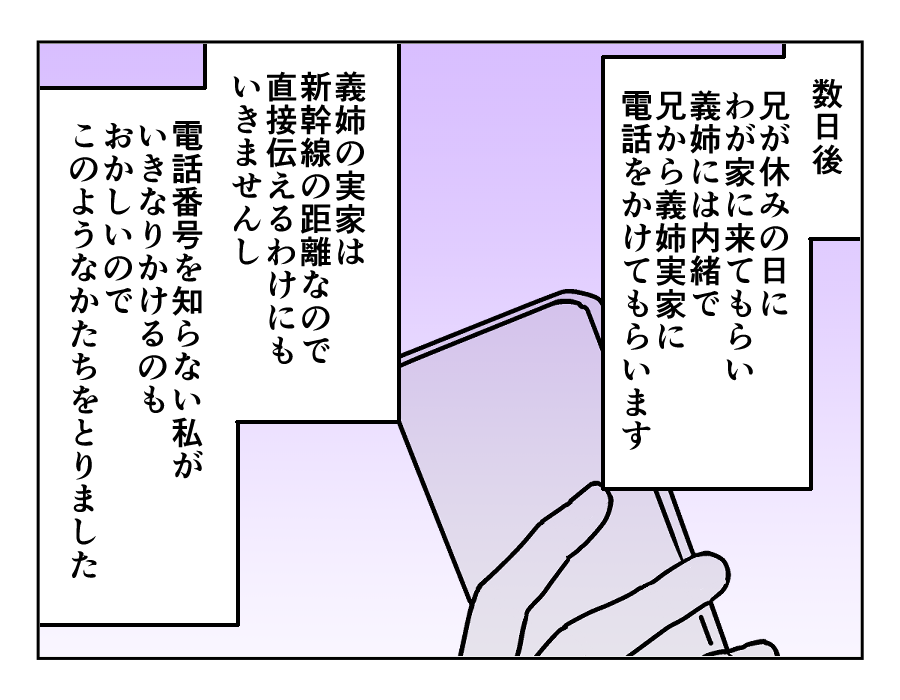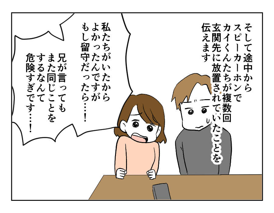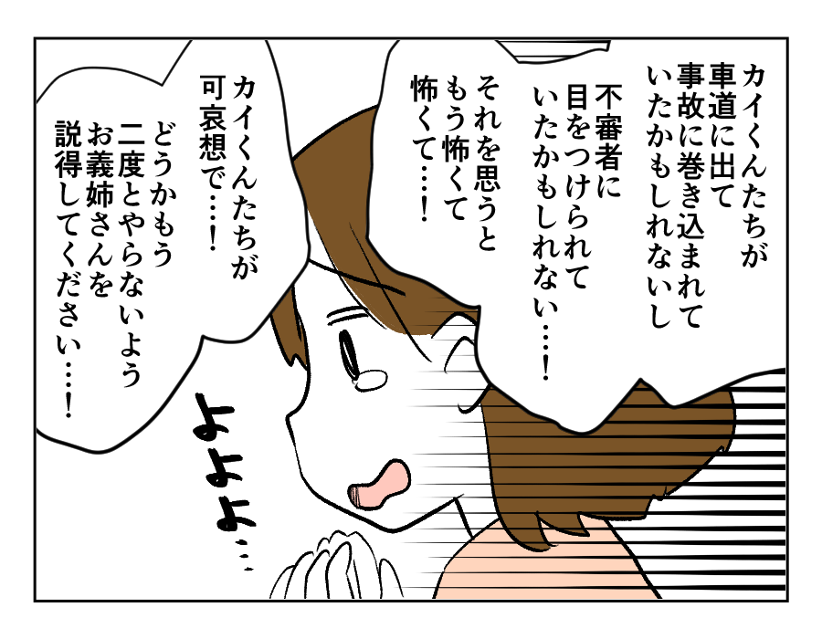 ミサキさんはまるで女優のように、「カイくんたちを不憫に思う叔母」を演じました。多少オーバーだったところもあったのかもしれませんが、じっさい事故に巻き込まれたり不審者に目をつけられたりする可能性もあったわけで、ミサキさんの発言は何も間違っていないと思います。お義姉さんのご両親も心配して、厳しく注意すると約束してくれました。