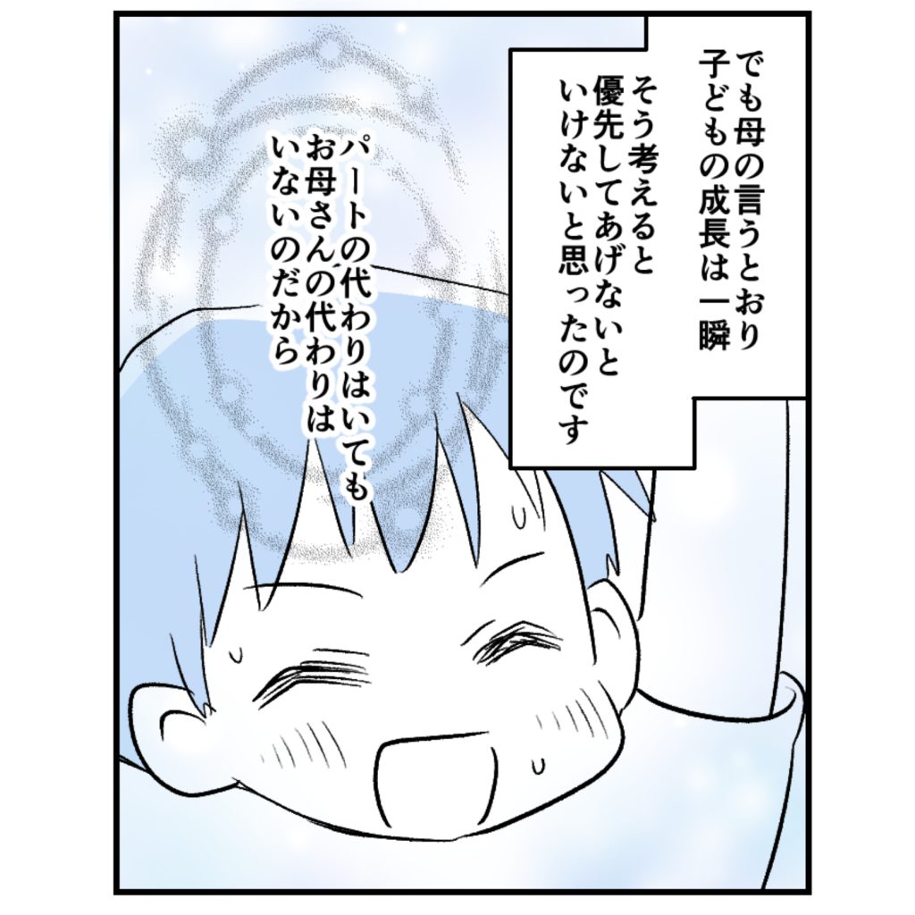 それでも「母の言うとおり子どもの成長は一瞬」そう考えると、わが子を優先してあげたいと思ったのです。息子にとって私の代わりはいません。助けてくれた先輩に感謝しつつ、これからも家族の時間を最大限大切にしながら生きていきたいと思いました。