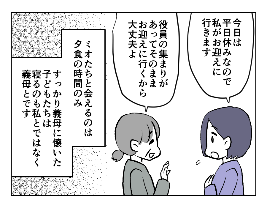 ミオちゃんたちの母親は、義母ではなくアイミさんです。それなのに、アイミさんの目の前で義母を「お母さん」と呼ぶミオちゃん。アイミさんはショックだったでしょう。アイミさんが「子どもたちは自分のことをどんな存在だと思っているのか」と考えてしまう気持ちもわかりますね。