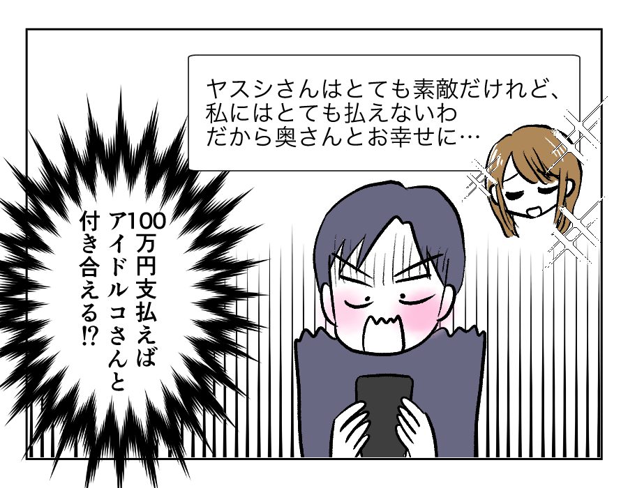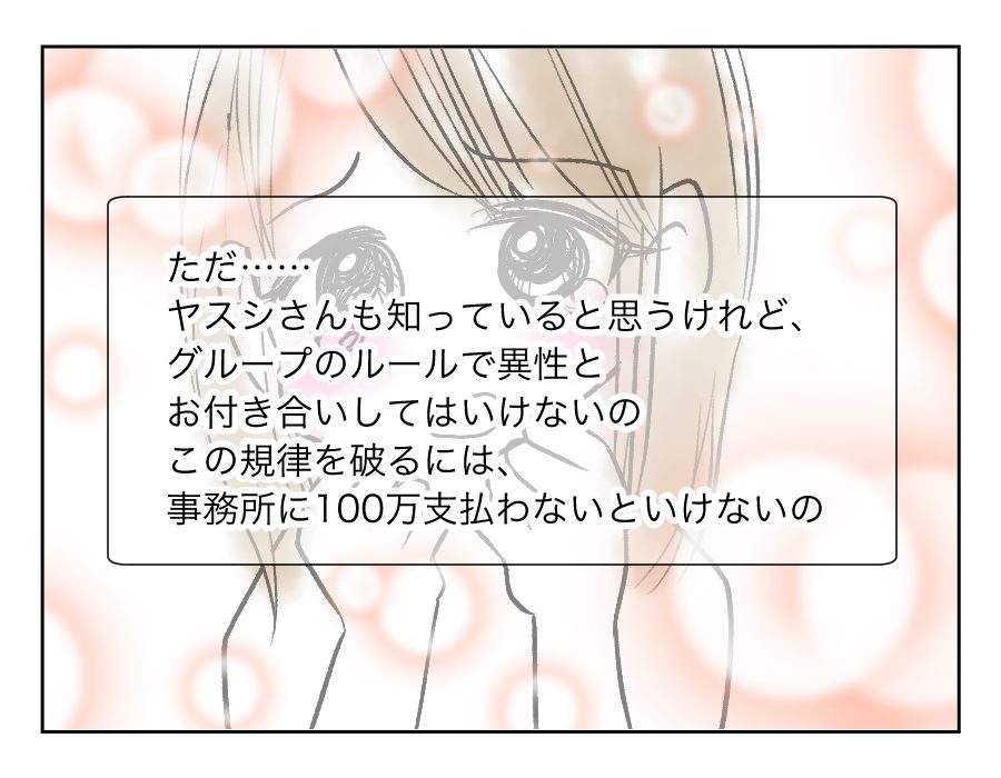 アイドルコさんが所属するグループは、たしかに恋愛してはいけないルールがあると、ヤスシさんは知っています。恋愛をして罰則でグループにいられなくなった子もいるのだとか。けれど100万円支払えば交際できるのなら、安いものだとヤスシさんは考えたようです……。