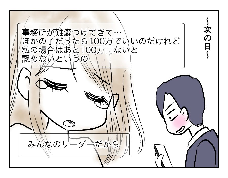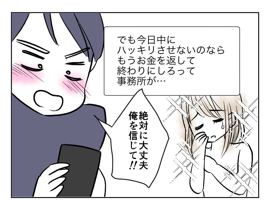 100万円を支払った翌日、さらに100万円がないと事務所が許さないと言われてしまいました。しかしお金はちゃんと返すと言ってくれているし、ここまできたらなにがなんでも交際したいヤスシさんは、お金を借りてでも支払う気のようです。いやいや……ヤスシさん、冷静になったほうがいいのではないでしょうか?
