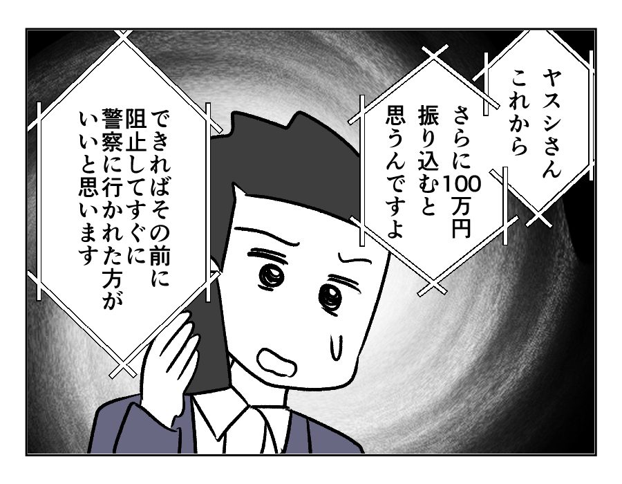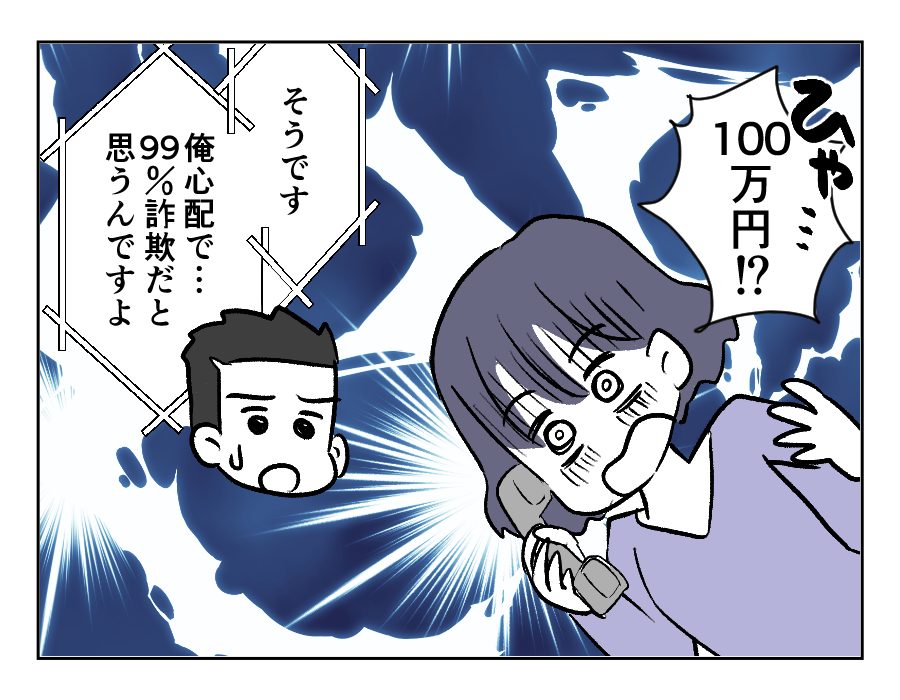 ヤスシさんの同僚は、ヤスシさんを心配してアキホさんに連絡してくれました。話を聞いたアキホさんは、同僚同様、「詐欺だ」と感じます。しかし肝心のヤスシさんと全然連絡がとれません。もしかしてもう100万円を振り込んでしまったのでしょうか……。