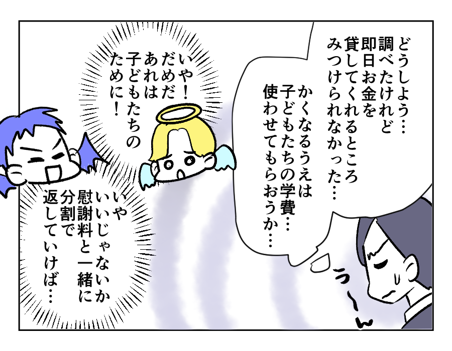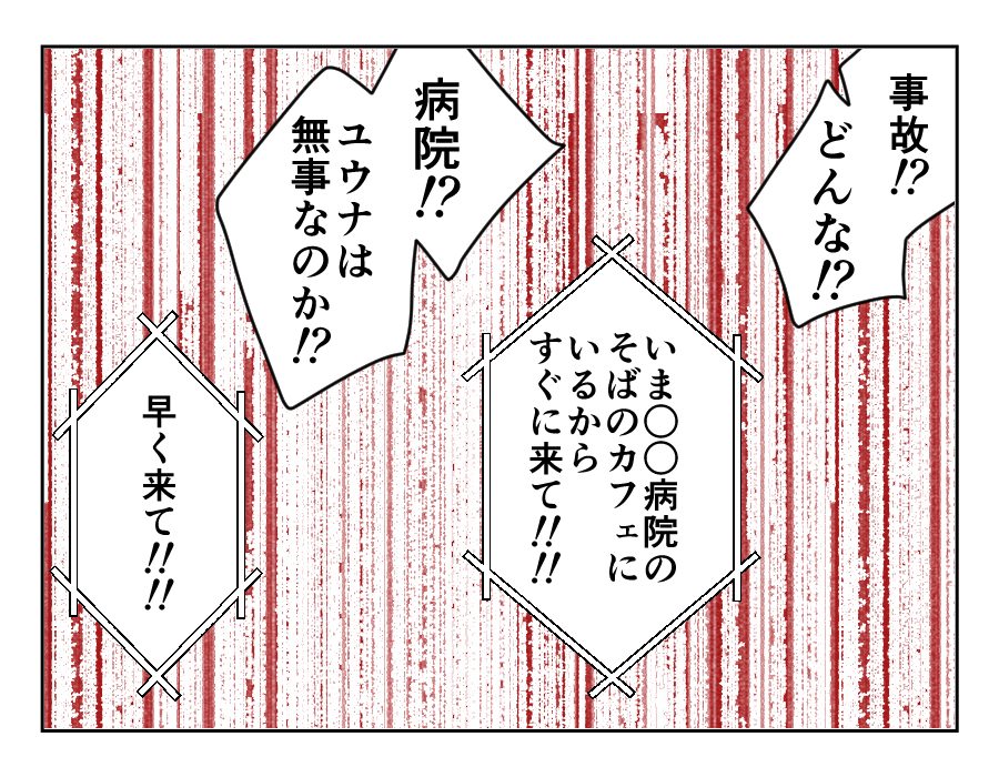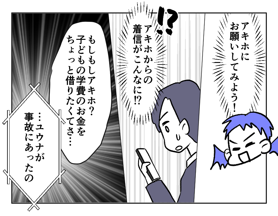 アキホさんはお子さんが事故にあって、いま病院そばのカフェにいるとヤスシさんに連絡をしたようです。これにはアイドルコさんのことしか考えていなかったヤスシさんも、衝撃を受けたようです。100万円のことを忘れて、指定された場所にダッシュしました。