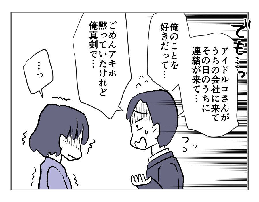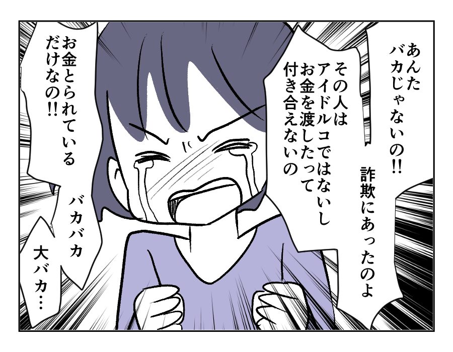 同僚もアキホさんも、ヤスシさんは詐欺にあっていると言います。けれどヤスシさんは信じられません。だってあと少しで大好きなアイドルコさんとの未来が掴めたのですから。公式サイトに「なりすまし」への注意喚起が出ていても、信じられないあたり、重症です……。浮気心を抱いたこと、お金を払ってしまったこと、全部まとめて謝ってほしいところです。