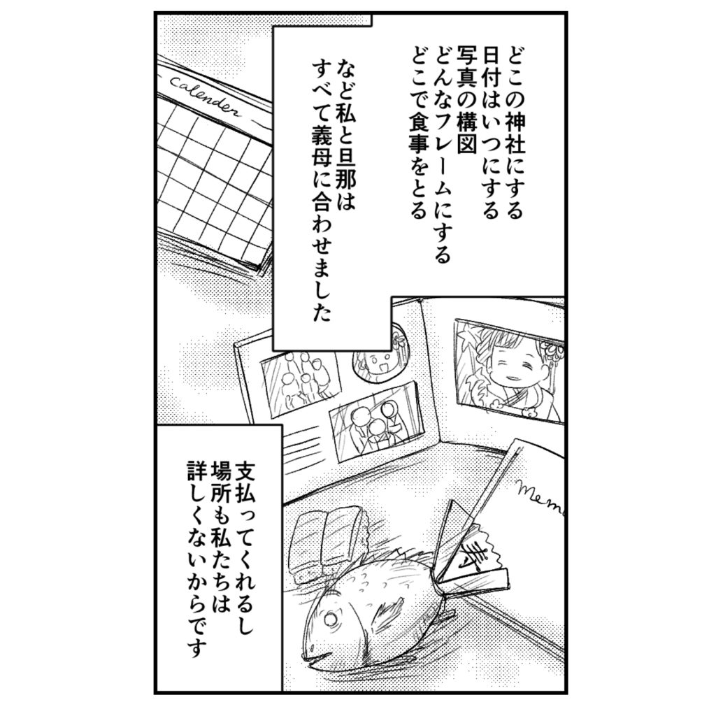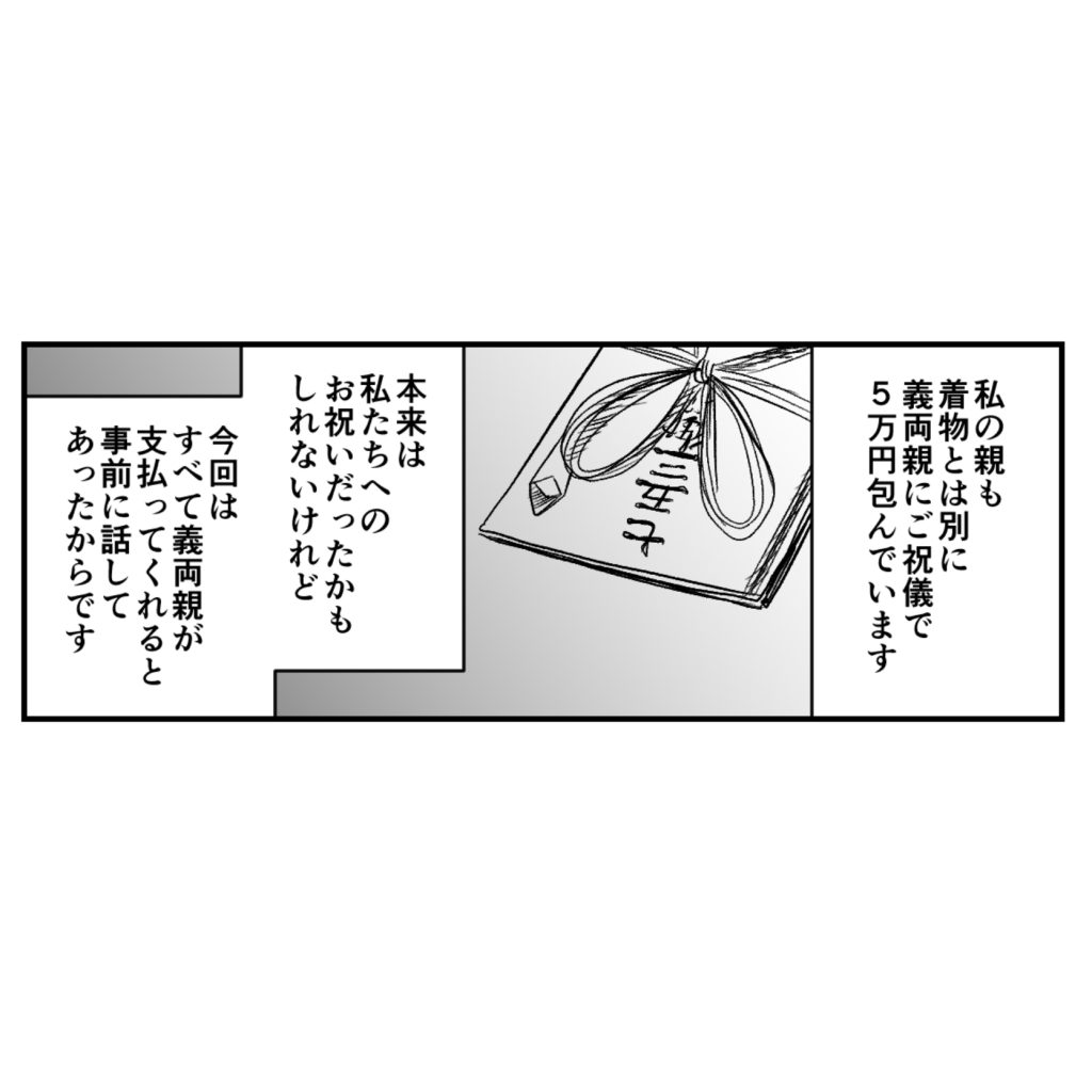 その後の食事会は、私の両親は参加せず、その代わり義妹家族3人が加わりました。当日は、着付け代金(着物は私の実家から)や神社への祈祷料、写真代、アルバム加工代、食事代はすべて義両親が出してくれました。「こちらも食事代など少しは出します」と打診しても固辞されたので、甘えました。