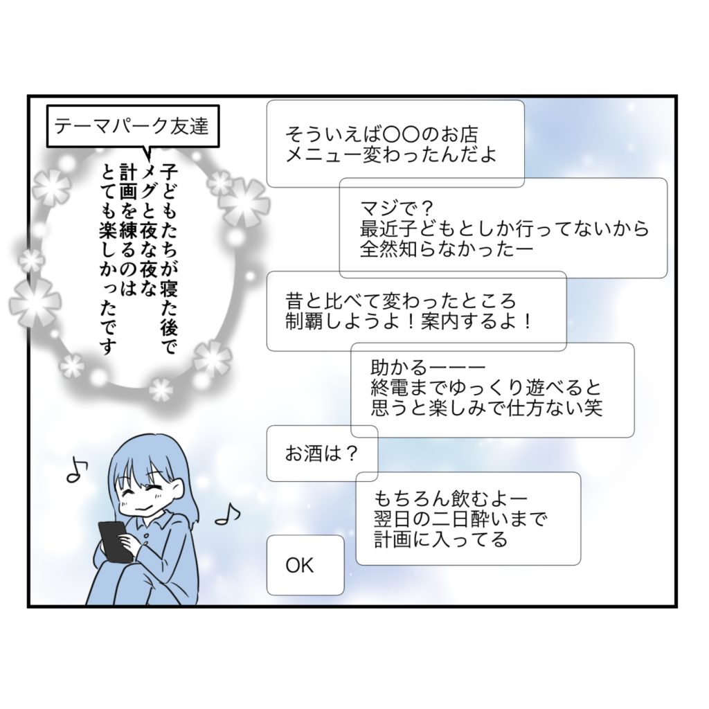 私のテーマパーク友達であるメグに声をかけると、すぐ賛成してくれました。普段も交流はありますが、一緒にテーマパークに行けるのは久しぶりです。2人で計画を立てながら、楽しみにしていました。子どもを妊娠し出産してから数年。ようやく心ゆくまでテーマパークを楽しめるときが来たのです。子ども連れと違う大人だけのテーマパークの楽しみ方。息抜きでもあり、共通に趣味を持つ仲間と心から笑ったり楽しんだりすることは私には大事な時間なのです。