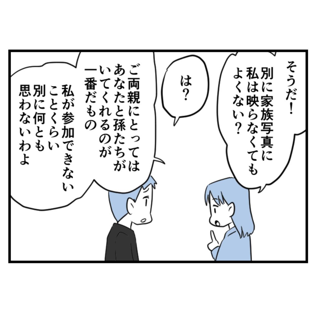 ユウジは「みんな都合をつけてこの日に集まっているんだから、悪いけど、頑張って実家まで来てくれよ」とたしなめるように言いました。義実家の人たちの予定や考えばかり優先されていて、私のことはどうでもいいの? とモヤモヤしてしまいます。ユウジも私の予定を知っているのに簡単に了承して決定事項として伝えてくるのも本当はイヤな気持ちがしました。ただ義姉の事情や義父の思いは理解したつもりです。私も妥協案を探ってみました。