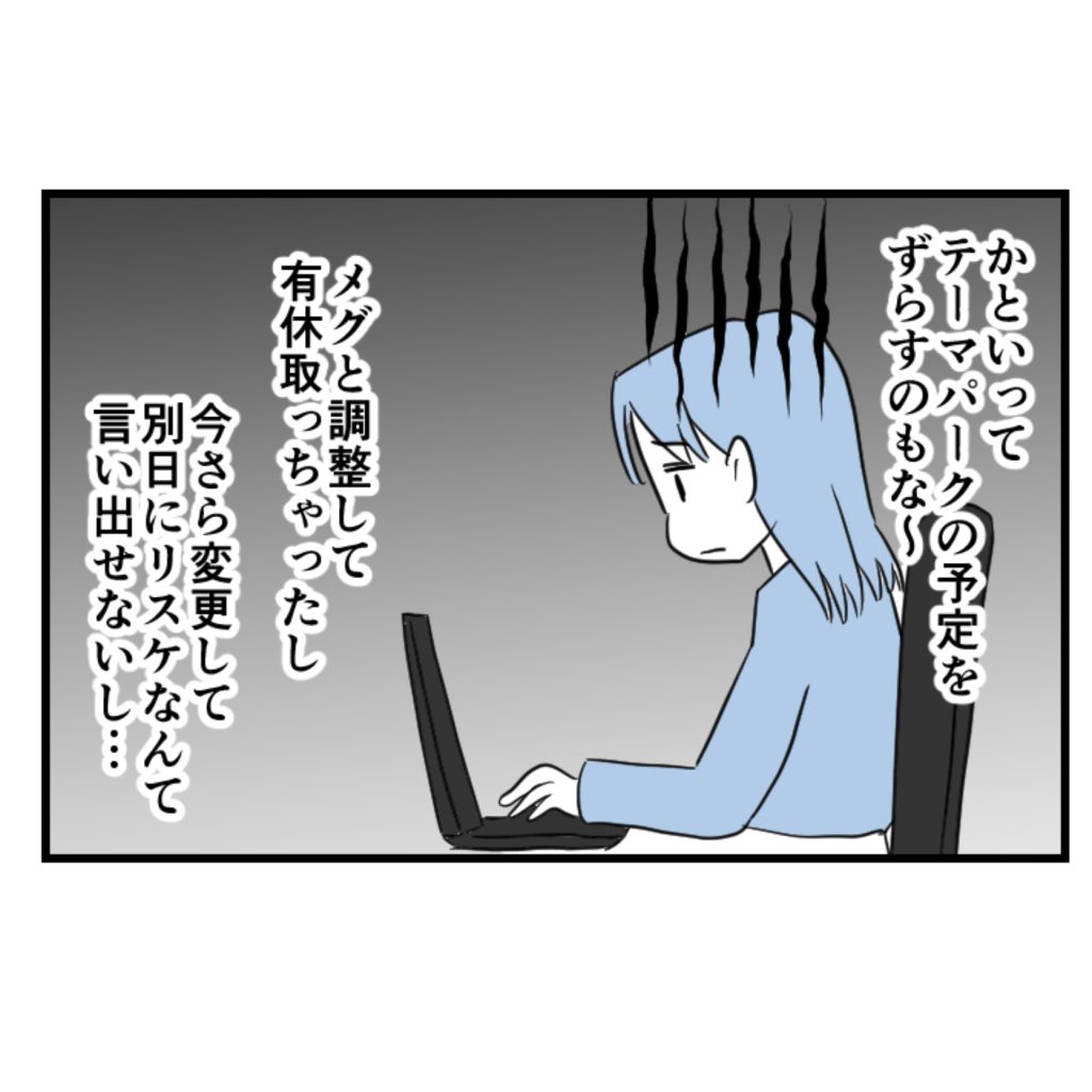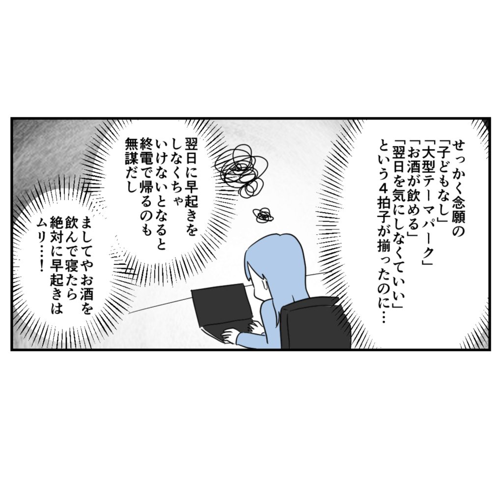 私(アキコ)は夫ユウジと息子カンタ(6才)、娘ユイ(4才)の4人家族です。子どもたちが自分でできることも増えてきたため、私たち夫婦はお互い「自分時間」も楽しもうという話になりました。ユウジは友達とツーリングに行き1泊旅行を満喫。私は12月に大型テーマパークに友達(メグ)と行って、始発から終電まで楽しませてもらうことになりました。久しぶりの“大人だけのテーマパーク”に心躍らせていたのも束の間、私が遊びに行く翌日に義実家の忘年会が入ってしまったのです。