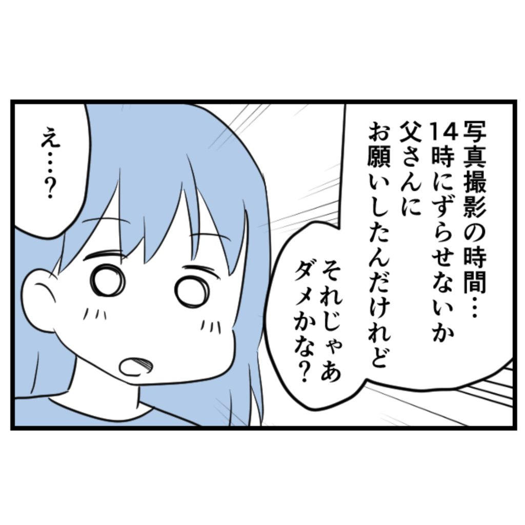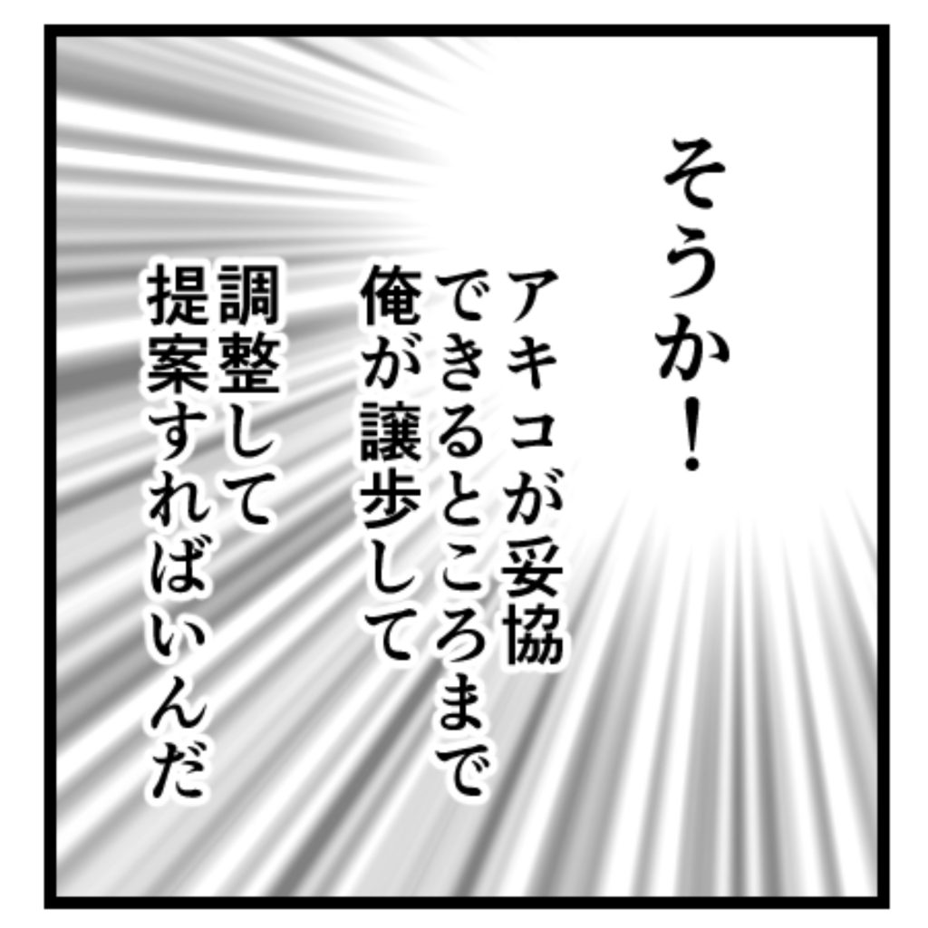 俺はそのことに気付いたとたんに自分の頭の中を整理しはじめた。「実家から決定事項だけ伝える」そのやり方が間違っていたんじゃないか。話が決まった後で、どちらかに不満があってもアキコが我慢するか、父さんが我慢するかを無責任になりゆきに任せていたんだ。アキコが妥協できるところまで、俺が譲歩して調整して提案すればいい。家族としてようやく自分のすべきことがわかった……!