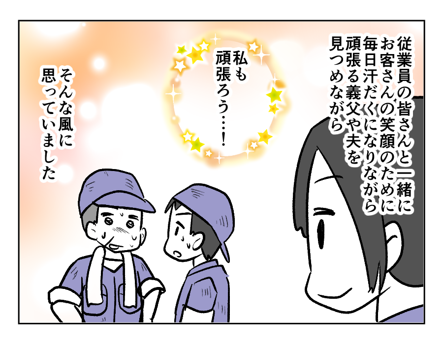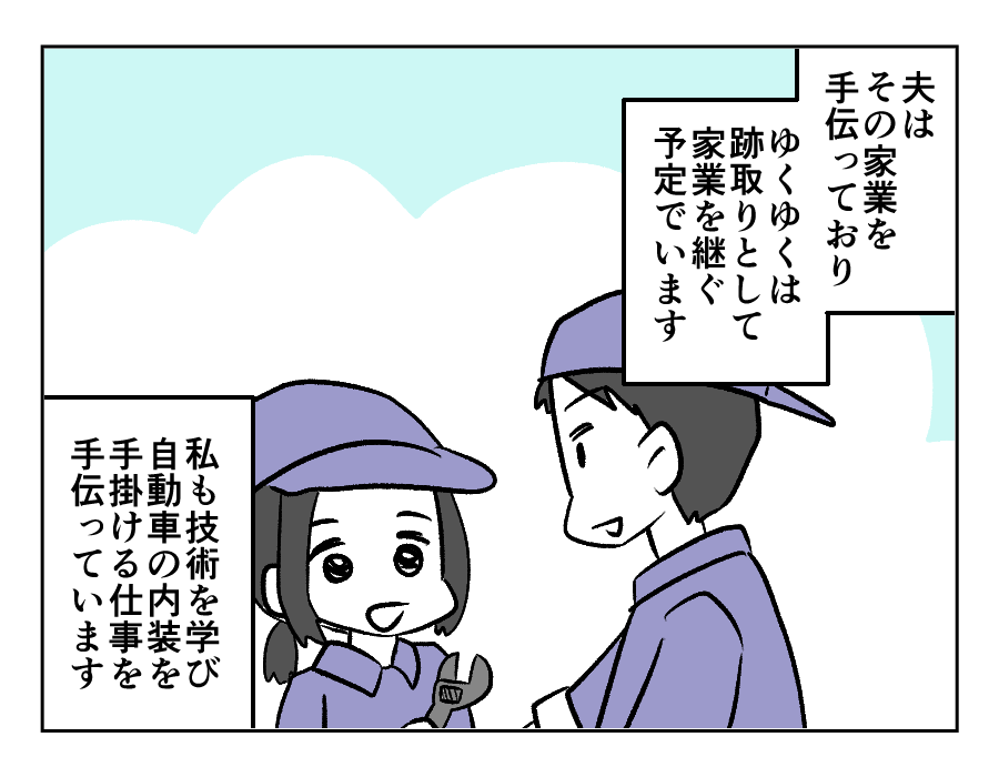 サクラさんが結婚したミノルさんのご実家は、先代から続く自動車整備工場。現在は義父が社長を務めていますが、ゆくゆくはミノルさんが跡を継ぐ予定でいるのだそう。サクラさん自身も自動車の内装を手掛ける技術を習得し、一家で家業を支えていました。義実家との不穏な話もよくあるなかで、皆で協力して頑張る姿はとても素敵ですね!