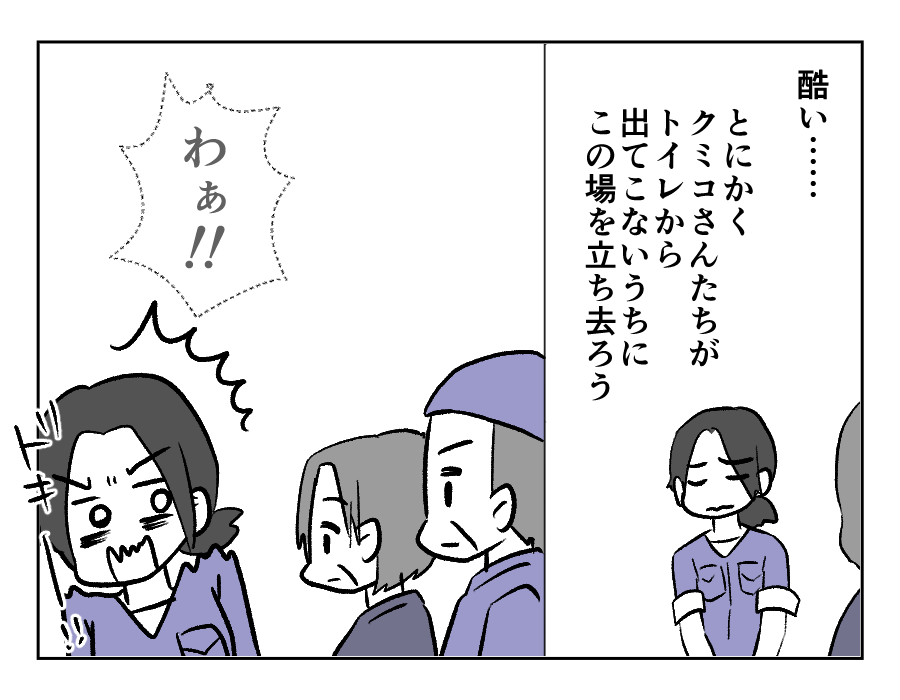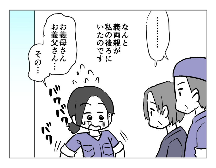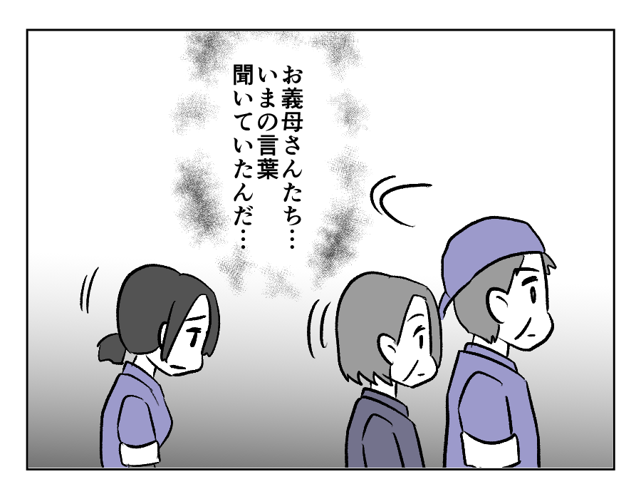 だから言ったジャーーーーーン! 案の定、義両親に聞かれてしまっていたようですね。悲しそうな義両親の顔を見て、サクラさんの胸も痛くなってしまいます。でもこの状況で「今の言葉聞いてました?」なんて聞きにくいですよね。だって「今のって、どんな言葉?」と聞き返されたときに、言葉に詰まってしまいそうですから。「お義父さんたちの仕事をバカにしてましたよ?」なんて平然と言えるほど、サクラさんは無神経ではないのです!