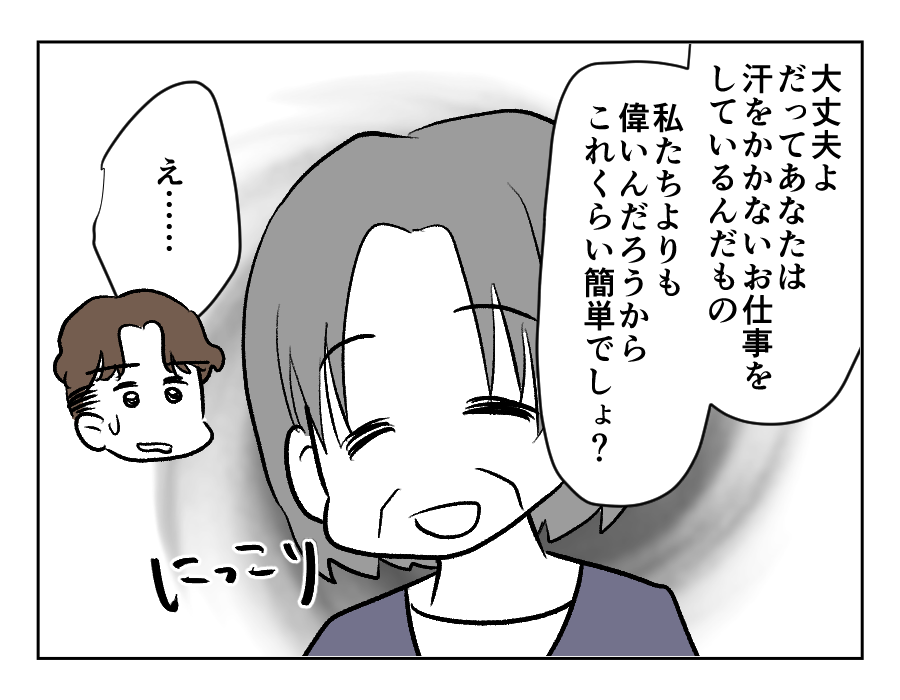 サラッと嫌味、キターーーー! 「同じ土俵に乗らない」と言っていた義両親ですが、同じ土俵に乗るどころか、タクミさんを笑顔で押し出して一撃食らわせているじゃないですか(笑)。サクラさんには心配かけたくないし、なるべく巻き込みたくなかったから、あえて「仕方のないこと」と言ったのでしょう。なんて思慮深い義両親! 「俺たちを見下すなら自分でやれ」うーん……まさにその通りです!