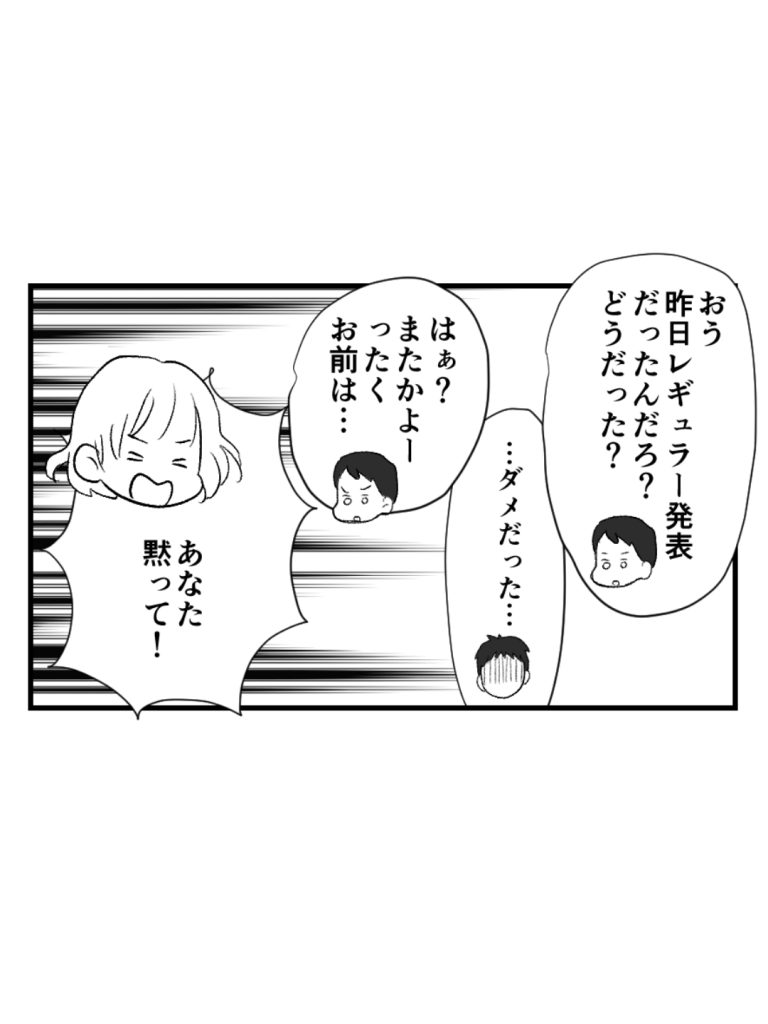 私:「あなたも口を出したいのであれば、まずは私たちと同じ目線になって言ってくれる? 息子がどれくらい頑張っているのか、知らないくせに偉そうなことばっかり言わないで」