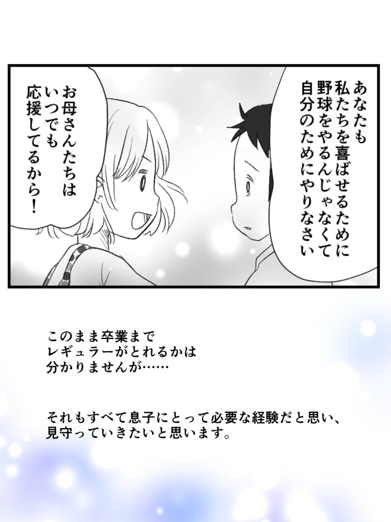 このまま卒業までレギュラーがとれるかは分かりませんが……それもすべて息子にとって必要な経験だと思い、見守っていきたいと思います。