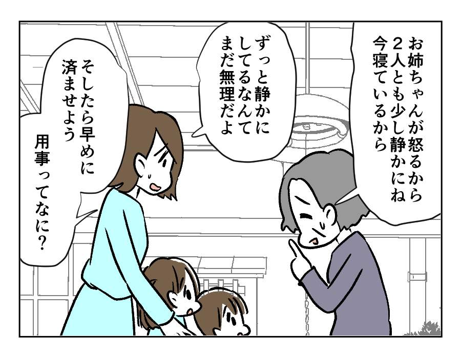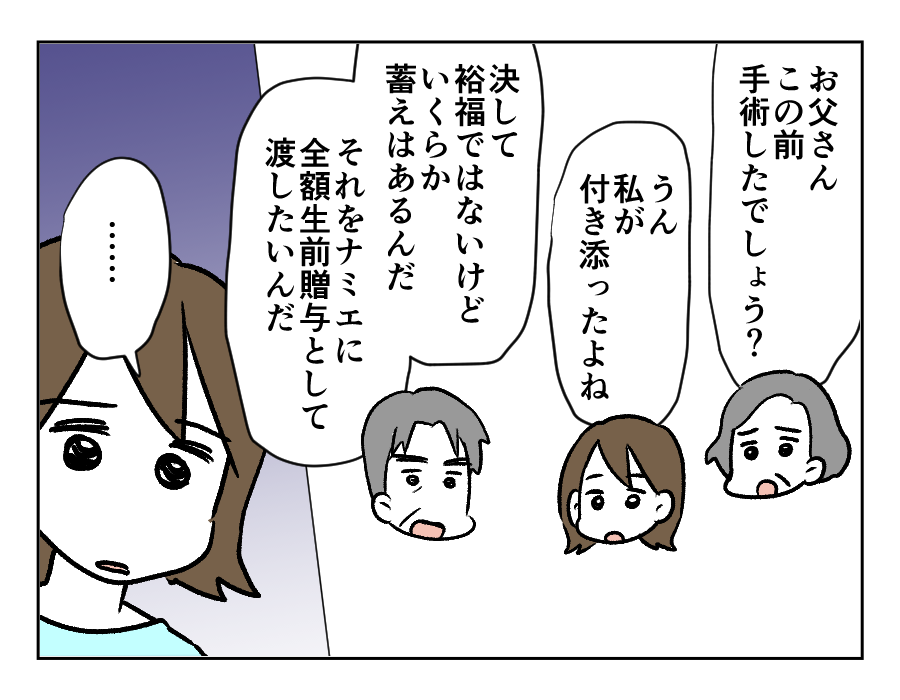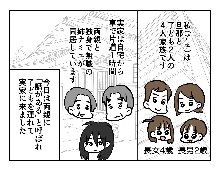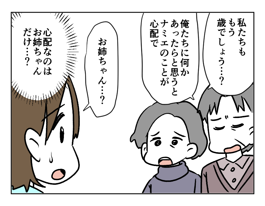 せっかく両親に孫たちを会わせても、ナミエさんの機嫌を損ねないよう孫たちに「静かにしてね」と言う両親。昔からアユさんの両親が心配するのは、姉であるナミエさんのことばかり。お父さんの具合が悪いときにアユさんが手術の付き添いをしても、病院への送迎をしても……。結局は長女であるナミエさんのことが気になるようです。仕事もしない、結婚もしない、独立もしない、そんなナミエさんの将来が心配のあまり、蓄えを全額ナミエさんに生前贈与したいと言うのでした。そんなことを言われて、すぐに納得は……できませんよね。