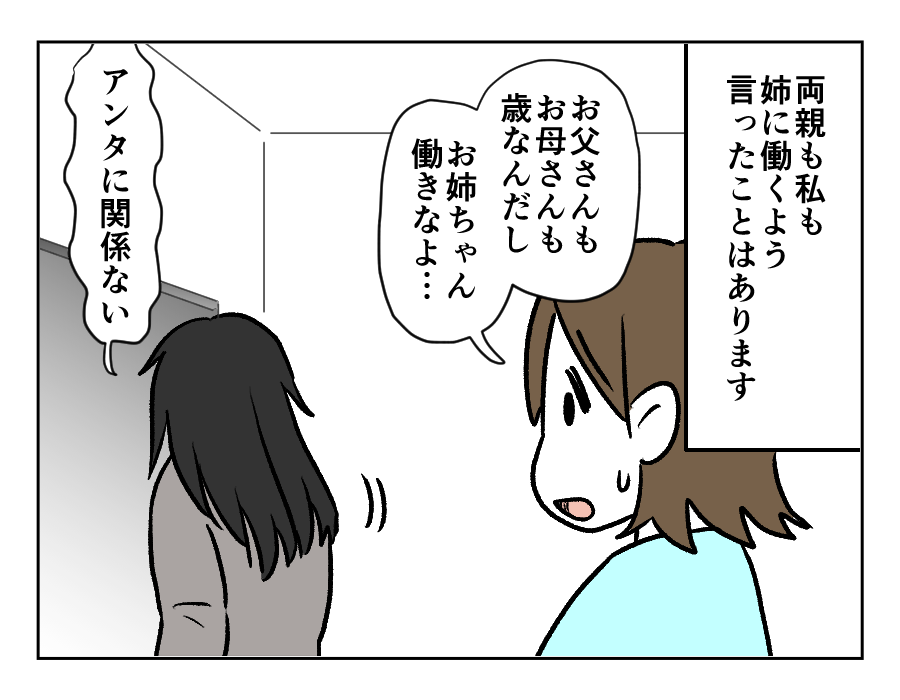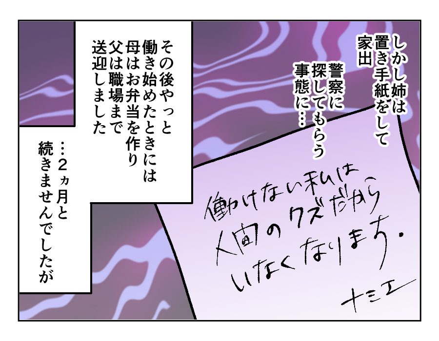 今まで何度か、家族全員でナミエさんに仕事をするように言ったそうです。家にこもっているのは健康にもよくないし、外で働けば友達も彼氏もできるのではないかという目論見もあり……。けれど言いすぎたあまり、ナミエさんは家出をしてしまったそう。最近では誰も仕事のことをナミエさんに言えなくなりました。