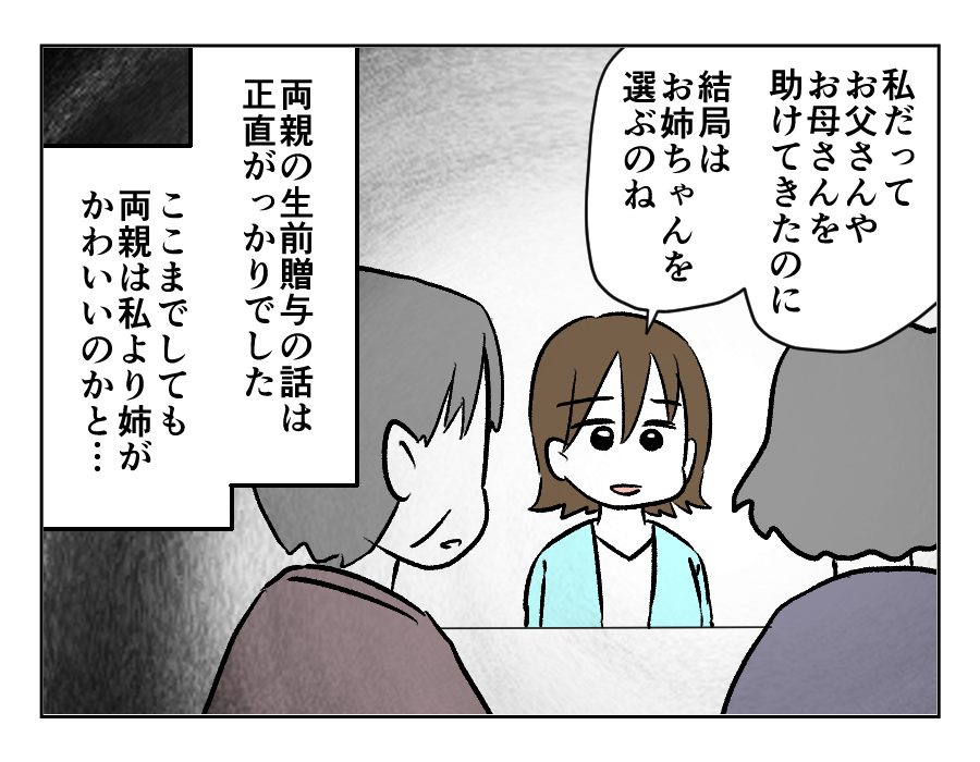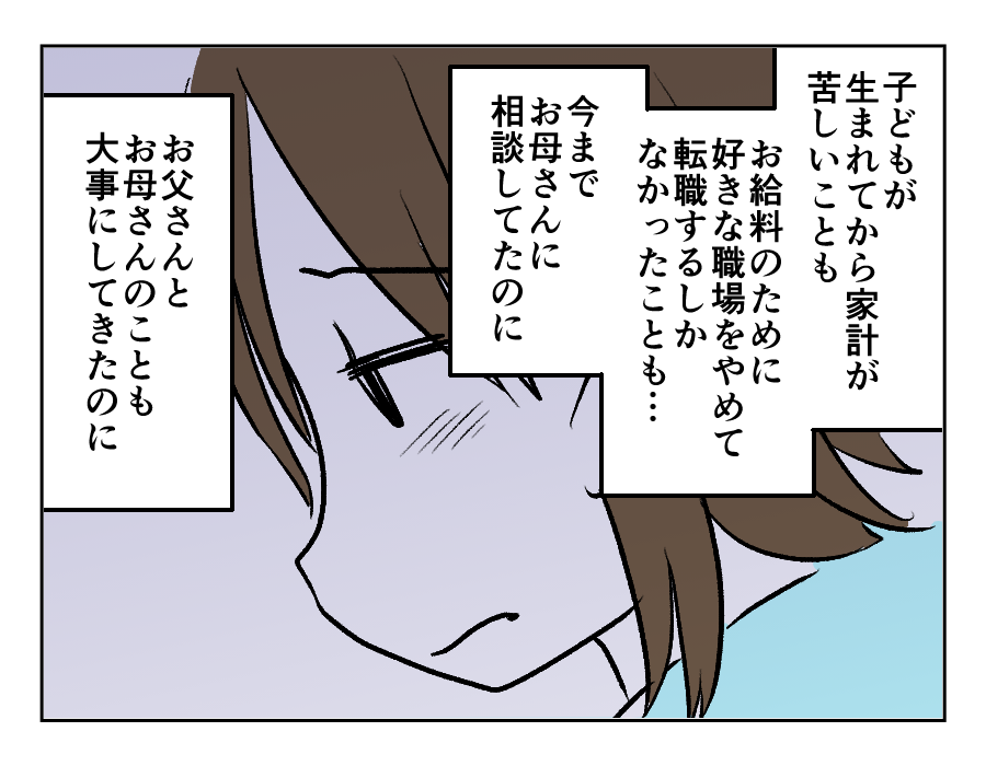 アユさん自身も決して余裕がある生活をしているわけではない様子。好きな職場もやめ、お給料が高いところへ転職したのですね。両親が「ナミエさんにアユさんより少し多くお金を渡す」だったらアユさんも納得したのかもしれません。けれど両親が選んだのは、「ナミエさんにすべて渡す」ことでした。
