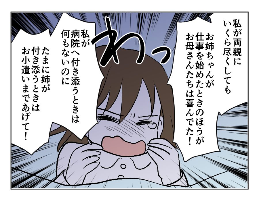 分配が平等であれば……いえ、せめて6対4や7対3であったならば、アユさんはこんなに辛い思いをしなかったでしょう。けれど両親は10対0だと言い、ナミエさんへすべて渡したいそうです。アユさんにとってそれは、両親の愛情の比率に思えたのです。