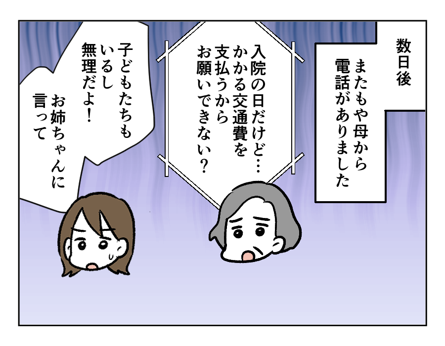 もしかしたら今まで通り頑張っていれば……いえ、もっと頑張っていれば、両親の愛情は自分に向くかもしれないと期待する気持ちがアユさんにもあったのかもしれません。しかし、期待しては裏切られ……の連続で。アユさんは両親とは一線を引くことを決断したようです。そして「姉を説得するのは親の役目」と両親に告げたのでした。