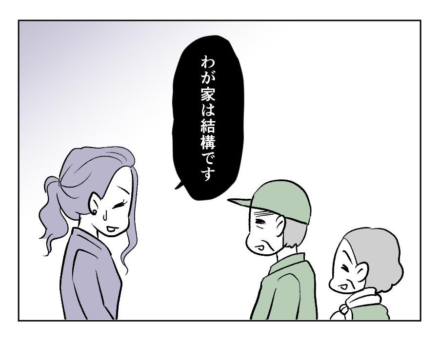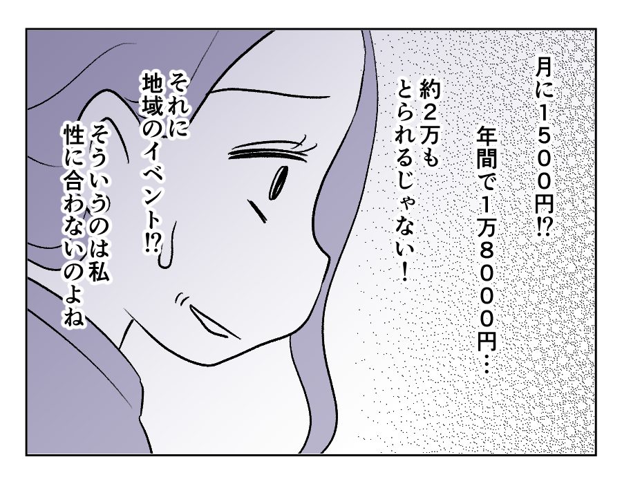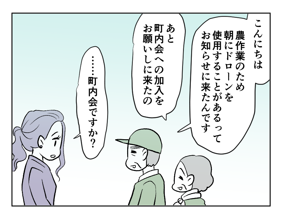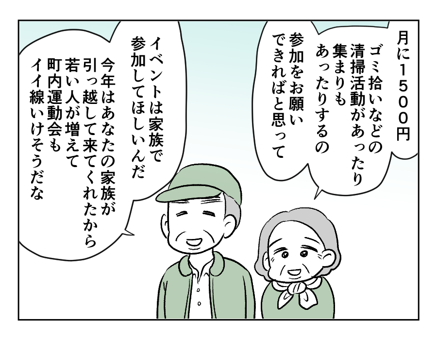 町内会費を徴収しに来た近所のおじいさんおばあさん。ミレイさんが住んでいた自治体には、こういったシステムがなかったようです。お金をとられて、行事の参加やボランティアをさせられるということで、ミレイさんはきっぱりとお断りを入れたのでした。