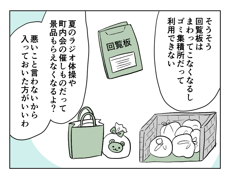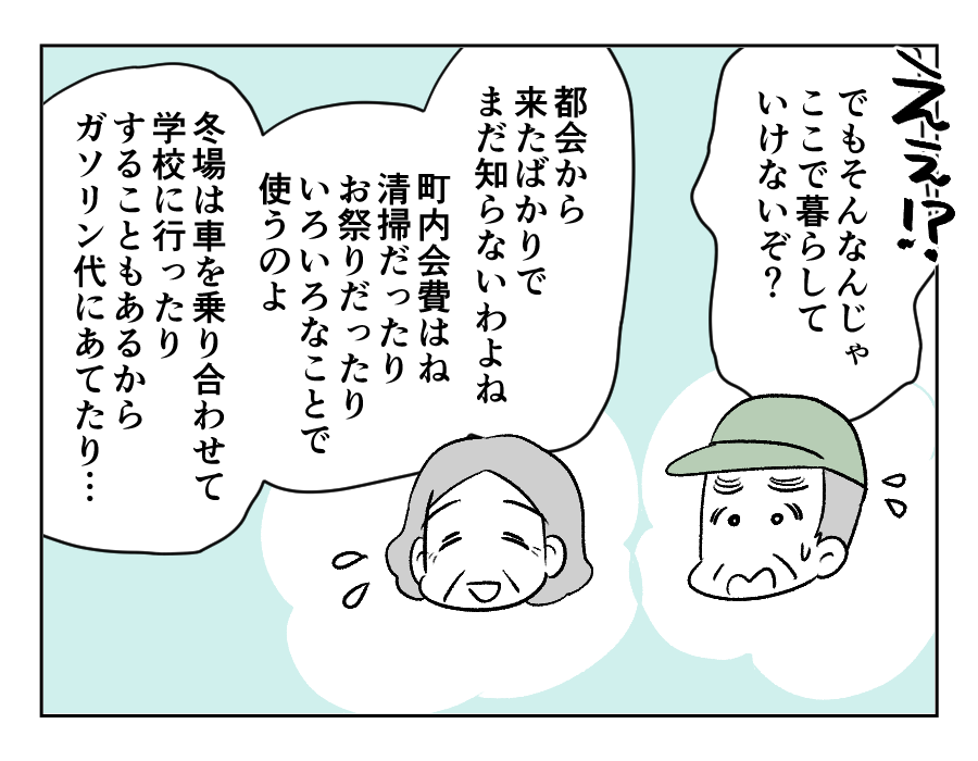 ご近所のおじいさんおばあさんは困った顔で食い下がります。このあたりの住人は、町内会費をみんな支払っているようです。町内会費を支払うと得られるメリットがあると教えてくれたのでした。しかしミレイさんは、メリットよりもデメリットの方が大きいと判断した様子。町内会に参加しないという意思を曲げませんでした。