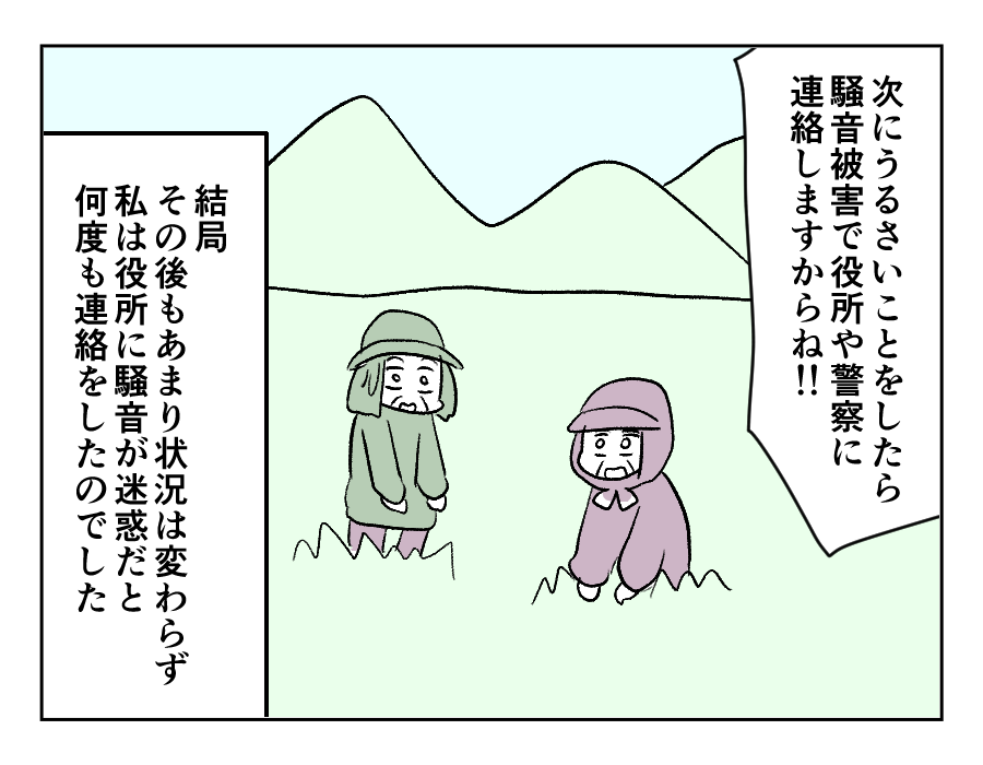 ミレイさんは近隣の住民と揉めたいわけではないけれど、言えば多少騒音がマシになるかもしれないと考えました。迷惑だとハッキリ言わないと、伝わらないとも思ったのです。それから多少はマシになった気もしますが、あまり変わらないので、宣言した通り役所に「迷惑だ」と、何度も連絡を入れたそうです。