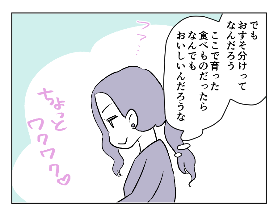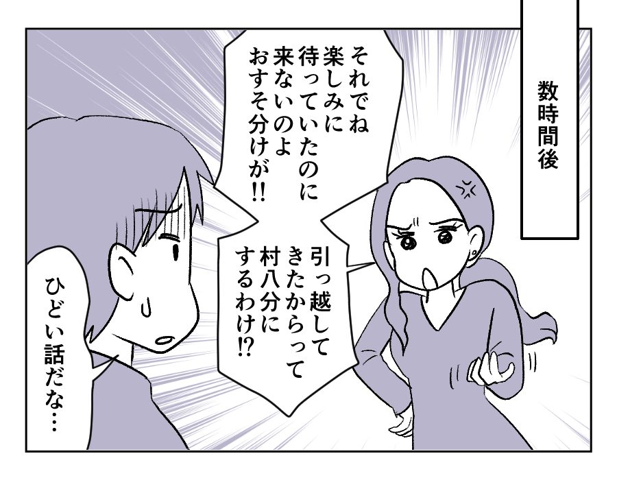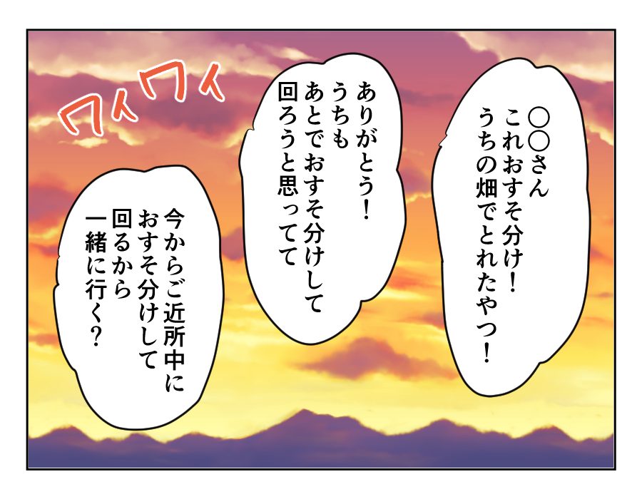 ご近所さんの立ち話から、お互いにおすそ分けしている様子が聞こえてきました。ミレイさんは当然、自分の家にも訪ねてくるだろうと思っていたのです。けれど待てど暮らせど、ミレイさんの家のチャイムは鳴らなかったのでした。