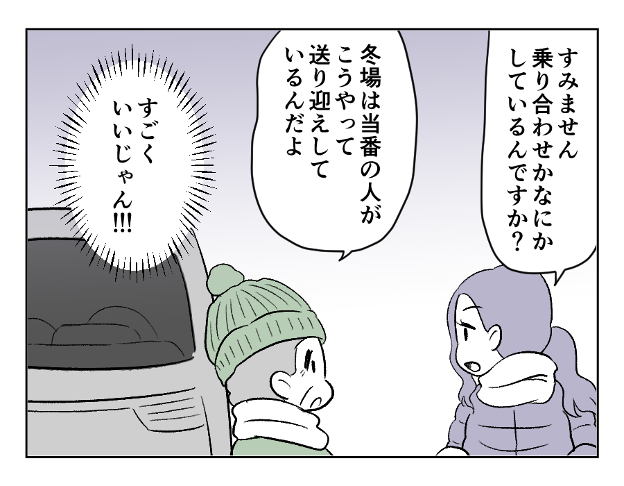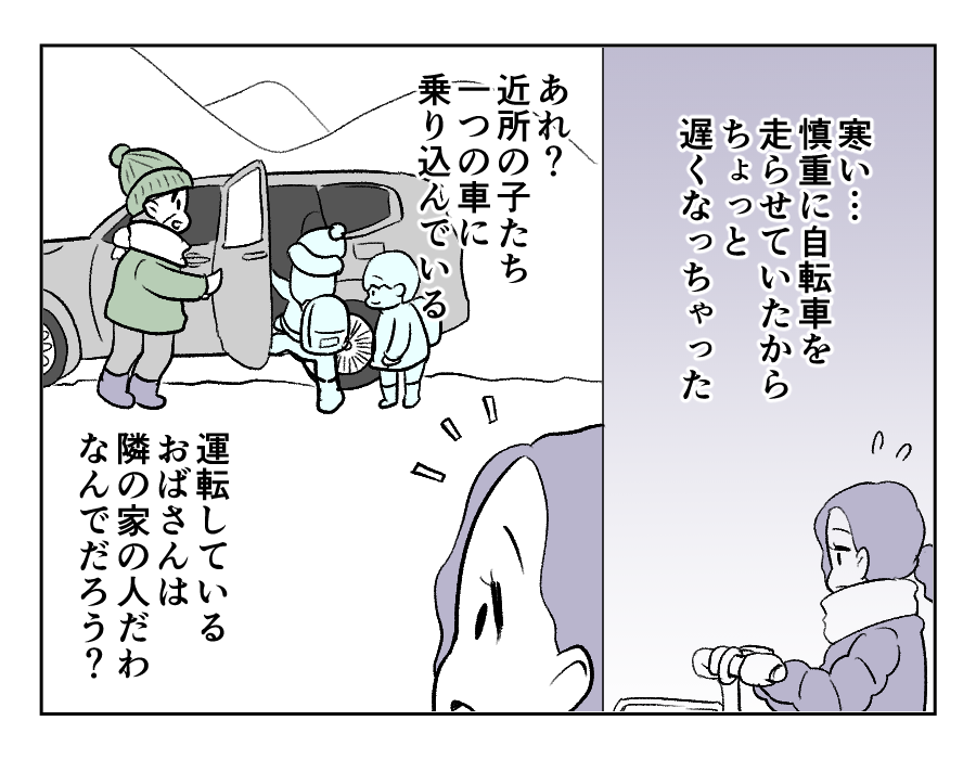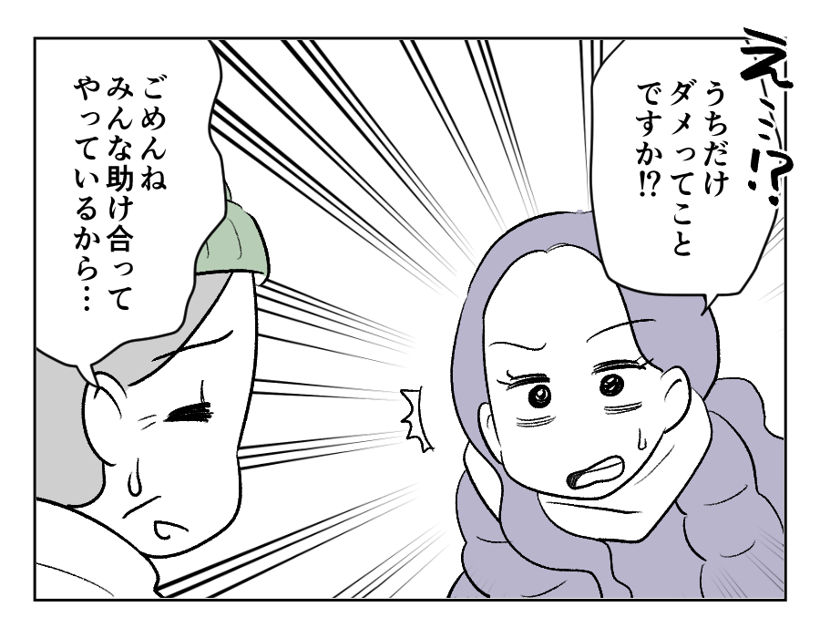 雪の日は近所の人が順番で保育園の送迎をしているよう。ミレイさんはその話に食いつきますが、お願いを断られてしまいました。ミレイさんは「子どもまで村八分にされるのか!?」と怒りと絶望を感じています。