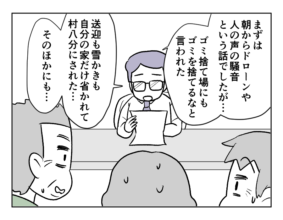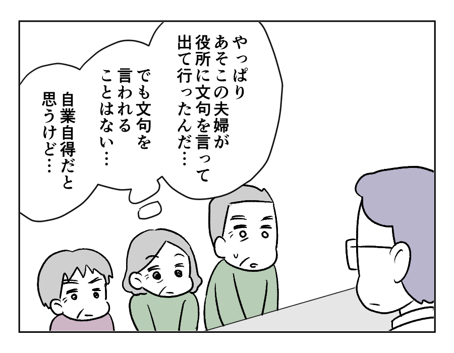 チヨコさんたち町内会役員は、役所に呼び出されました。チヨコさんは大体の予想がついていたようで、案の定ミレイさん家族からの苦情を聞かされたのです。役所が言っていることは、たしかにその通りです。けれど……チヨコさんたちにはチヨコさんたちの言い分がありました。
