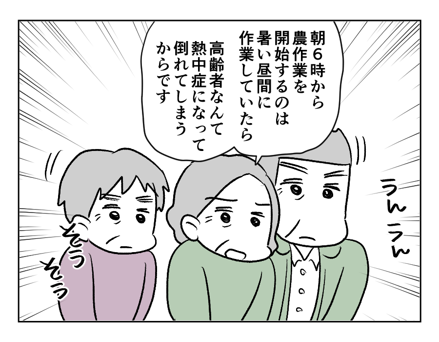 このあたりの人たちは、朝早くから農作業をしたり雪かきをしたりする生活をしています。それは住人たちの生活や、命がかかっているからです。雪かきを朝しなければ事故につながる可能性がありますよね。夏の昼間に農作業をしていたら、とくに高齢者は熱中症で倒れてしまう人がいるかもしれません。チヨコさんは、すべてのことにはちゃんと理由があると怒りを覚えました。