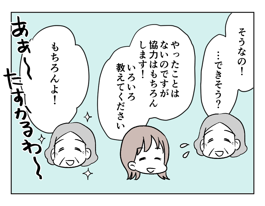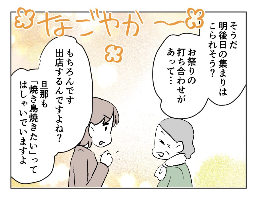 エリさんは近隣の人たちと和やかに話をしています。おすそ分けももらって、とても楽しそう。たまに井戸端会議にも参加しているようですよ。ご近所の人も、ミレイさんのときとは違い、親しみのある表情をしていますね。