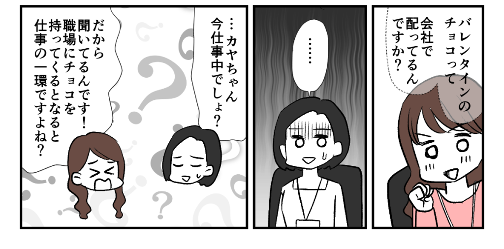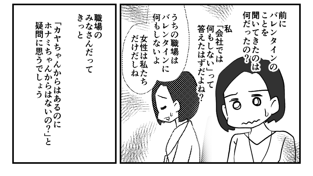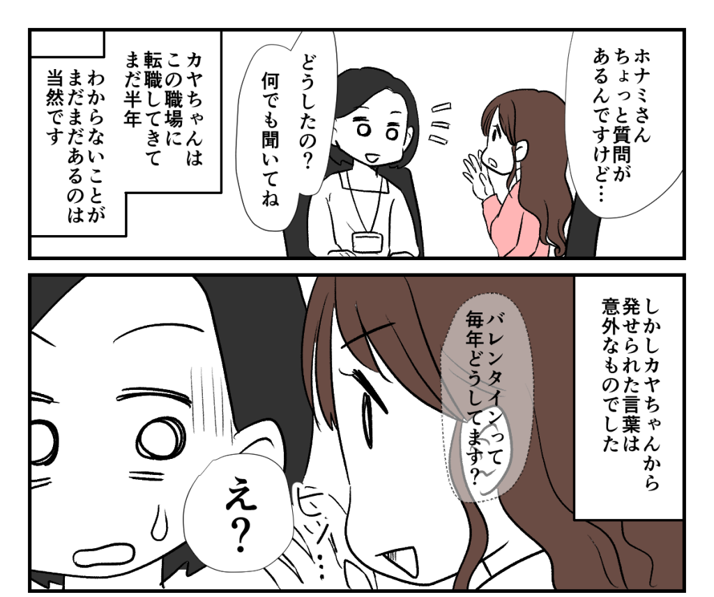「この職場でバレンタインには何もしない」と事前に伝えておいたにもかかわらず、笑顔でチョコを配り歩いていたカヤちゃん。当然ながら職場のみなさんは喜んでいましたが、ひとりだけ仲間外れにされてしまったような私は、もちろんいい気はしません。私に質問してきたにも関わらず配り歩くなんて、彼女は最初からチョコを持ってくるつもりだったのでしょうか……。とはいえ何か事情があるのかもしれません。とりあえずお昼休みになったら、カヤちゃんに話を聞いてみようと思います。