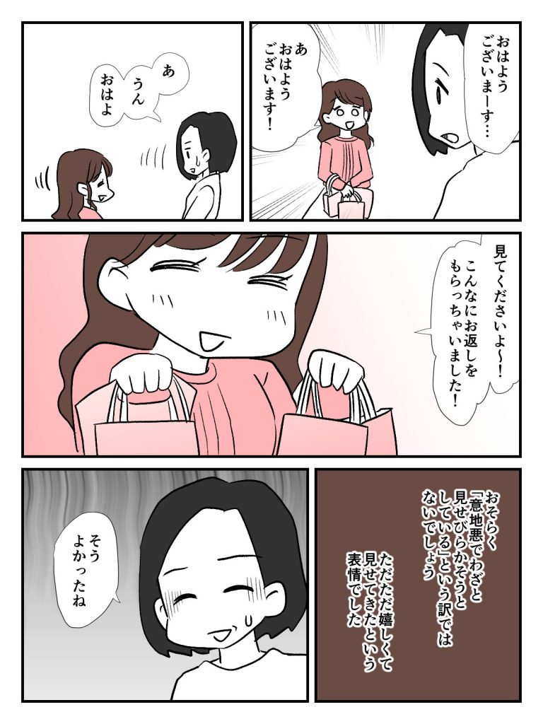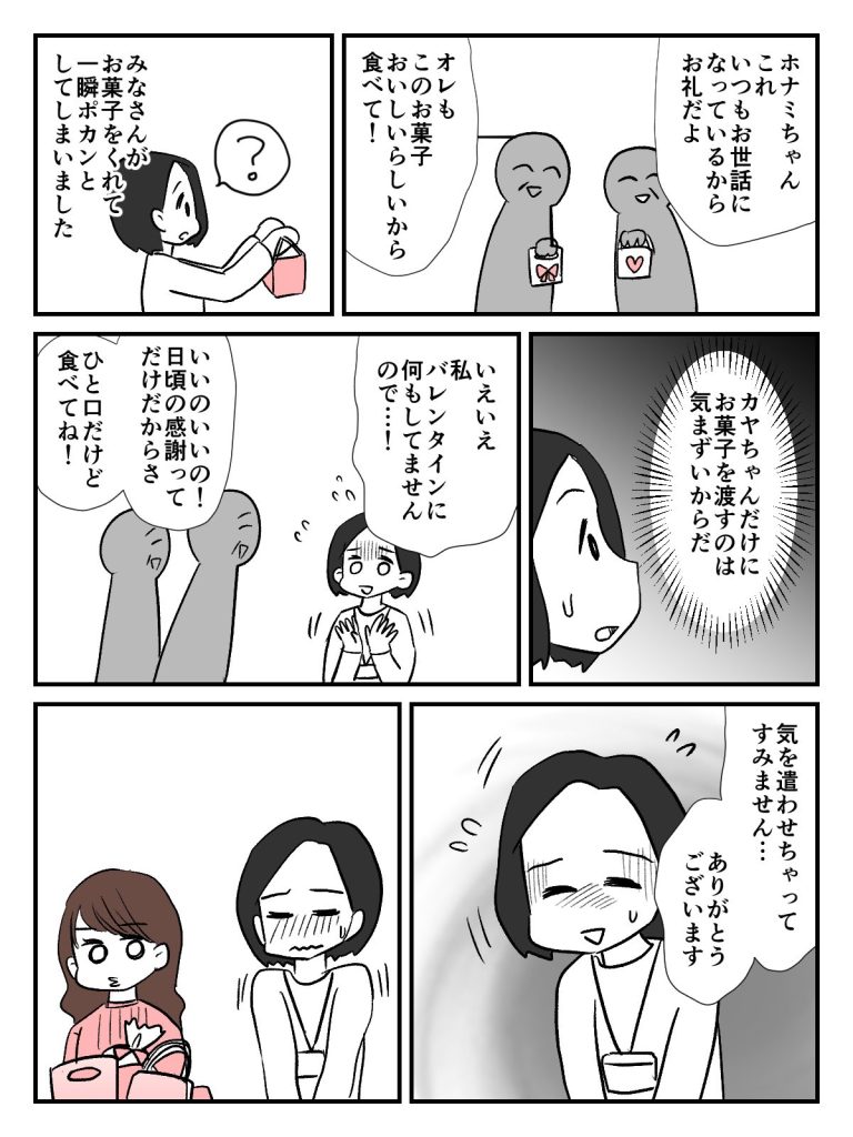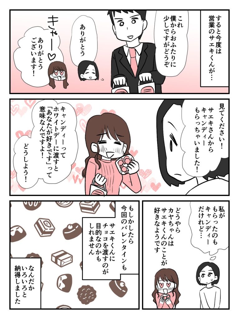 ホワイトデーに思いがけず職場のみなさんからお菓子をいただいてしまって、私は恐縮するばかり。申し訳ないという気持ちはありますが、気まずい雰囲気にしないようにと考えてくれた職場のみなさんの心配りには感謝しかありません。一方カヤちゃんの様子を見ると、どうやらサエキくんにチョコを渡したくて職場全体にバレンタインを持ち込んだようです。カヤちゃんはサエキくんからのお返しを喜んでいました。カヤちゃんのバレンタインは大成功。一ヶ月ほど気持ちが振り回されましたが、あとは落ち着いて仕事に集中してほしいものです……。