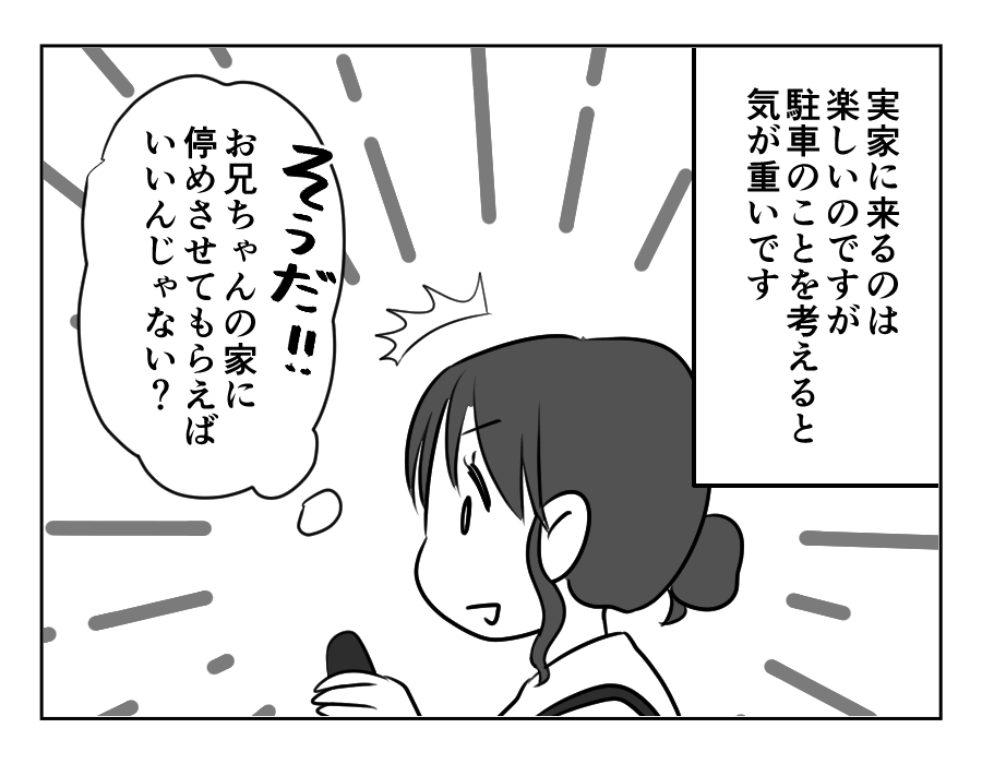 エマさんの車は旦那さんと兼用。最近車を買い替え、旦那さんの好みで車が大きなサイズになり、以前から苦手だった駐車がさらに難しくなったそうです。慣れない車、さらに新車で、「絶対にこすれない!」というプレッシャーからエマさんは毎回ヒヤヒヤしながら駐車している様子。最近では実家に向かおうとすると、あの狭い駐車場がふっと頭に浮かび、ブルーな気持ちになってしまうエマさんなのでした。
