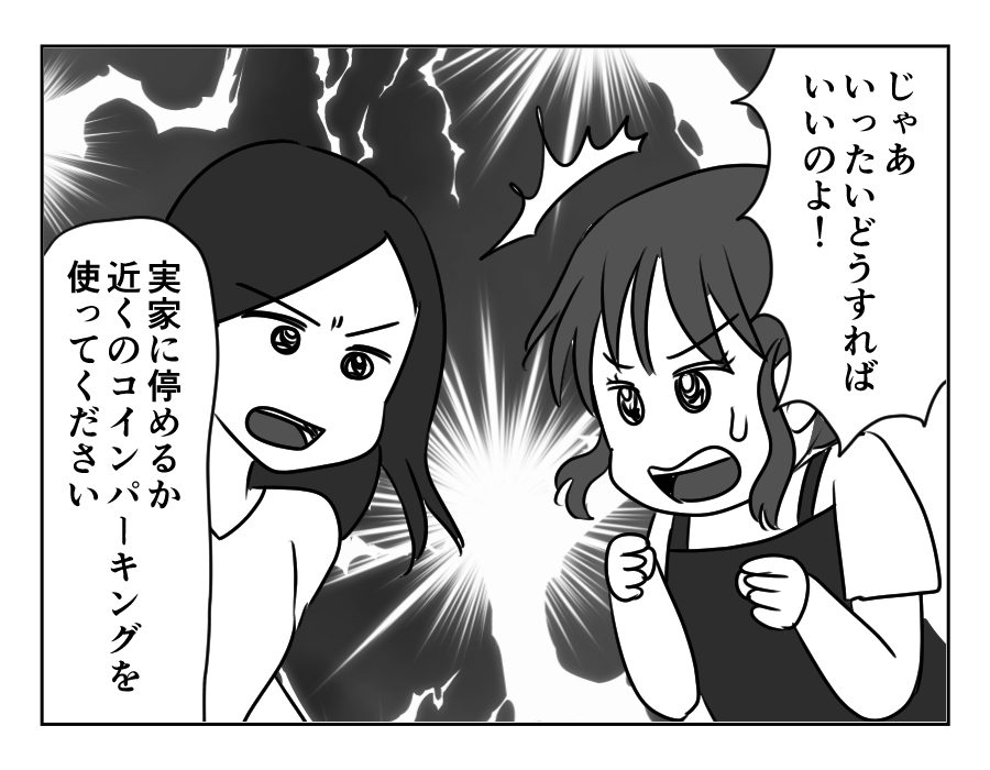 「ここに停めればタダなのに、ヒカリさんがあれこれ言うからコインパーキングに停めるハメになった。だからコインパーキング代を出してよ!」というのがエマさんの言い分です。しかし自宅の敷地をどう使うかは、そこに住んでいる人たちが決めることですよね。ヒカリさんが「停めないで」と言っている以上、エマさんも「すみませんでした」と言って引き下がるのが普通だと思うのですが……まさかのコインパーキング代請求となりました。