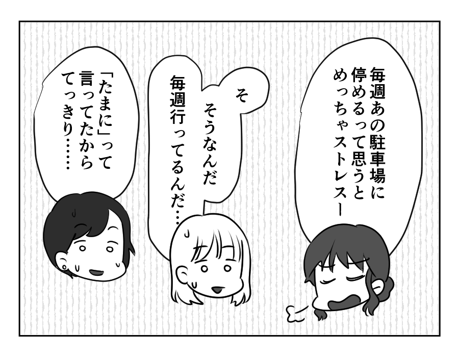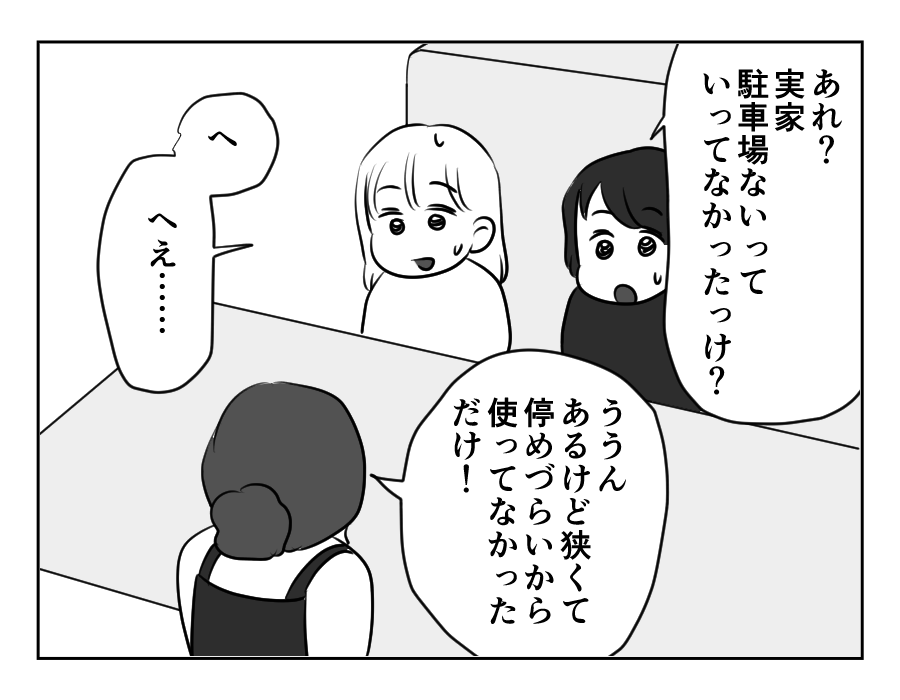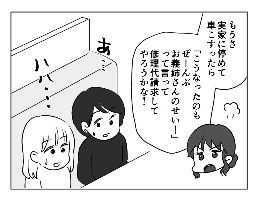 本当は実家に駐車場があったこと、お義姉さんの家に停めるペースは全然「たまに」じゃなかったこと……。エマさんの話がウソばかりで、ママ友たちはドン引きです。そのうえ「こすったらお義姉さんに修理代を請求してやる」とは……。さすがに冗談でしょうけれど、あまりの他責思考に、ママ友たちは「この人と深く関わらないほうがいいかも」と感じはじめたようです。